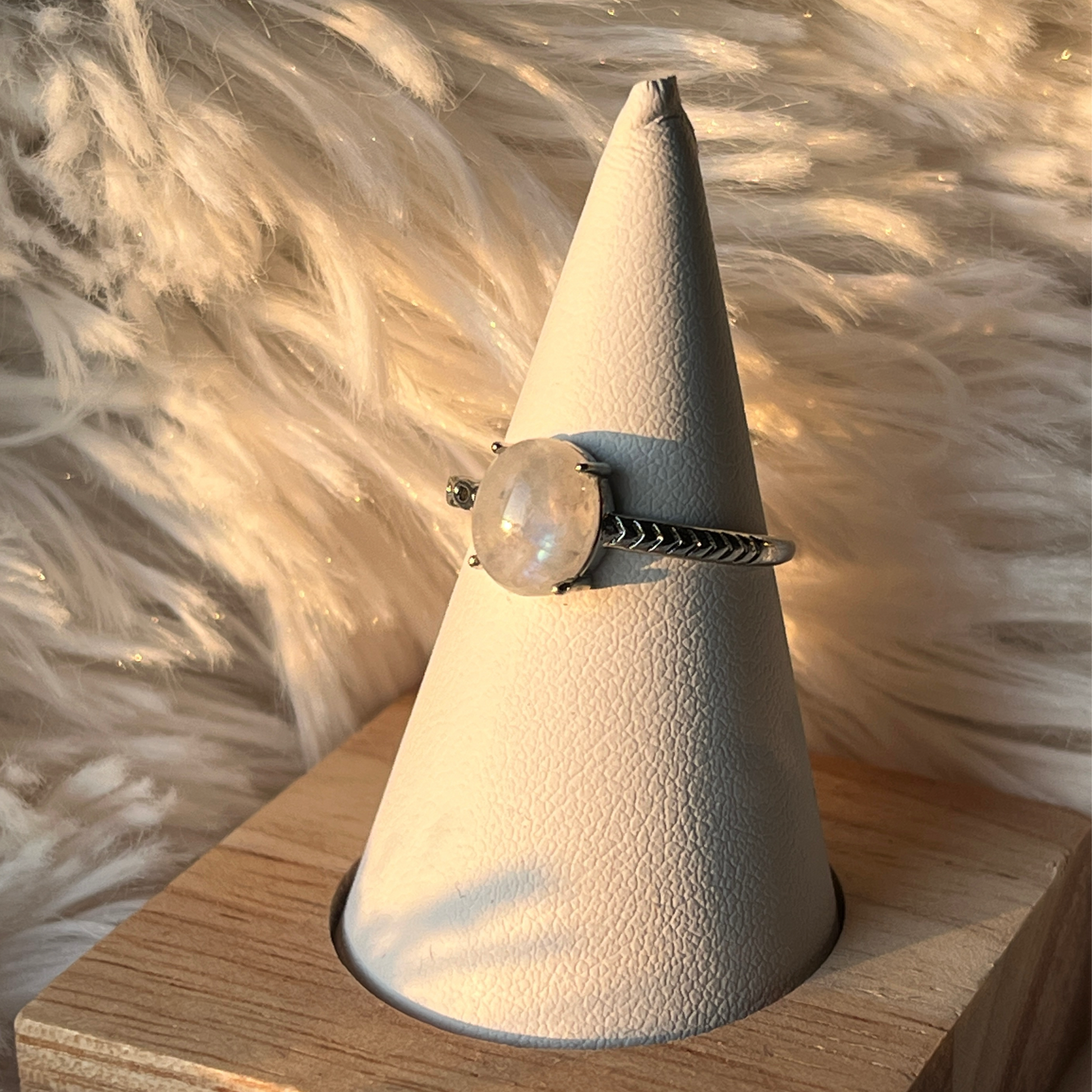 Anello regolabile in Rame placcato Argento con Labradorite bianca centrale