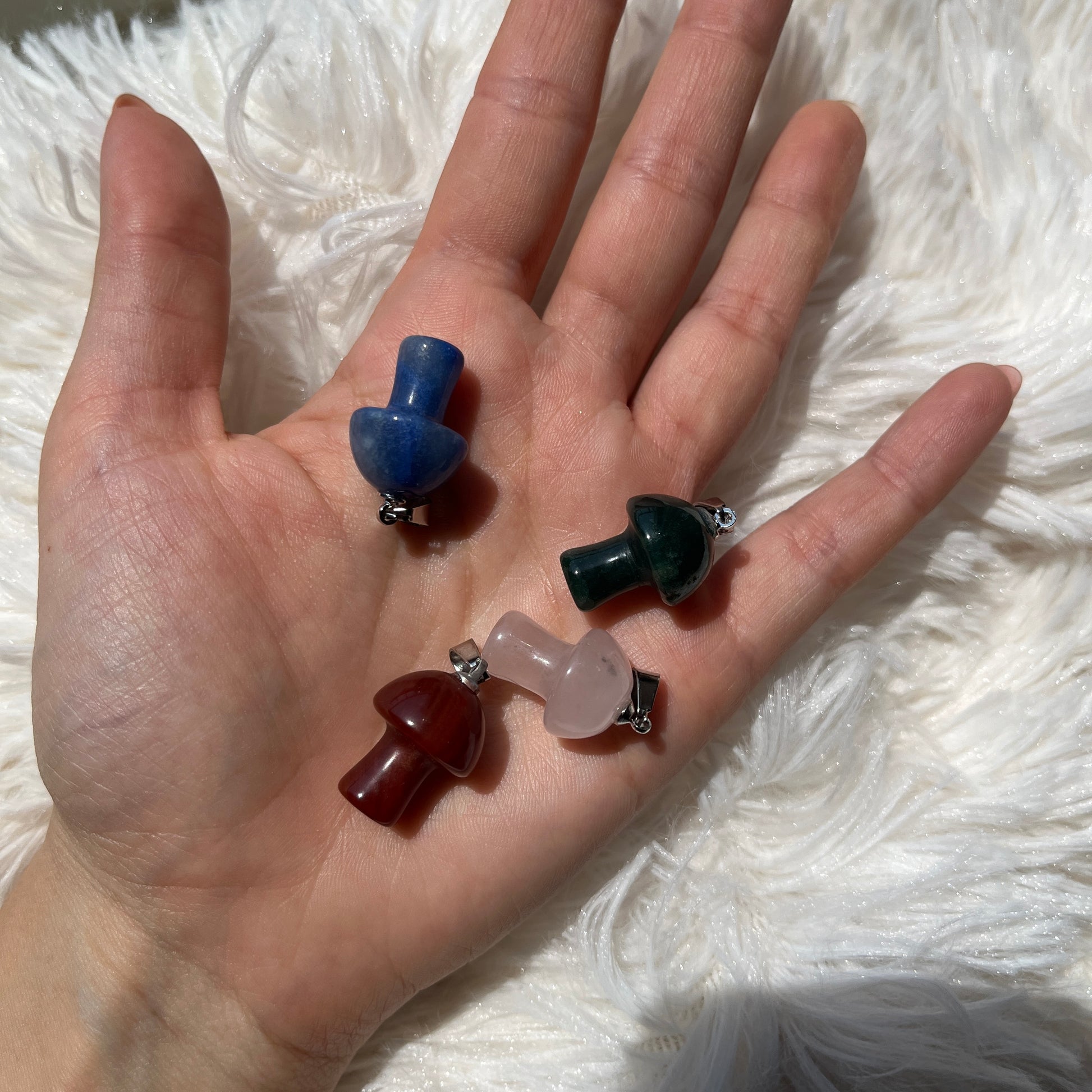 Funghetti in Agata Muschiata, Sodalite, Corniola e Quarzo rosa. Gancetto in Argento 925.
